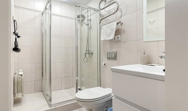 Санузел: с душевой кабиной, тапочки, туалетные принадлежности, фен
