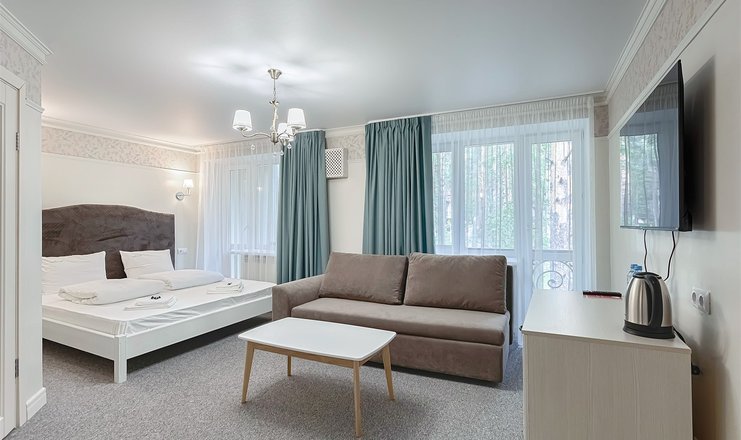 В номере: диван раскладной, кровать двуспальная, столик журнальный, тумба, шкаф, телевизор, холодильник, чайный набор посуды, электрочайник