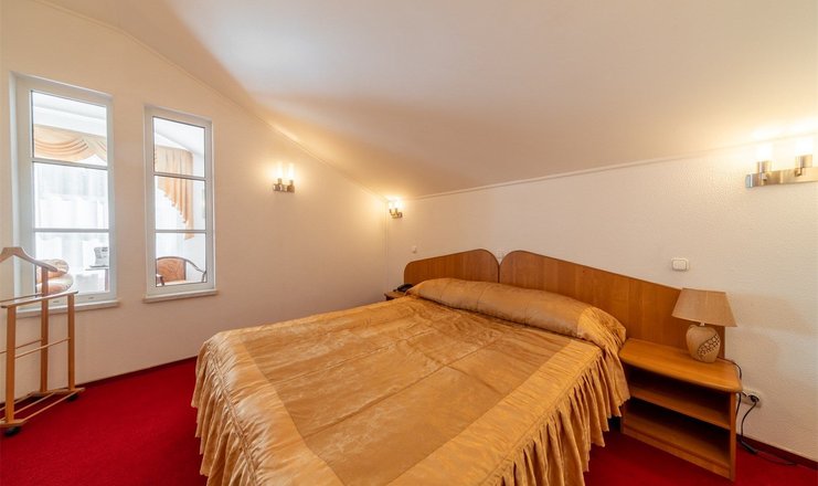 Мебель: Кровать двуспальная или кровати односпальные, тумба, стол, стул, шкаф