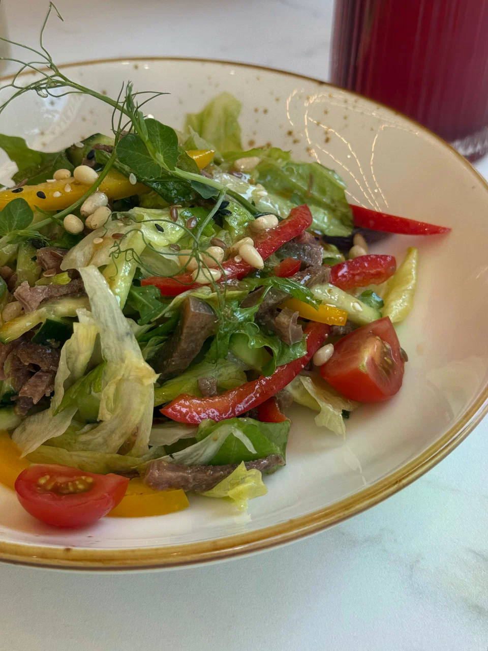 - Свежие салаты, сезонные овощи и фрукты, включая местные сорта